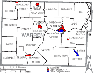 TOWNSHIPS: Brokenstraw Township, Cherry Grove Township, Columbus Township, Conewango Township, Deerfield Township, Eldred Township, Elk Township, Farmington Township, Freehold Township, Glade Township, Limestone Township, Mead Township, Pine Grove Township, Pittsfield Township, Pleasant Township, Sheffield Township, Southwest Township, Spring Creek Township, Sugar Grove Township, Triumph Township, Watson Township