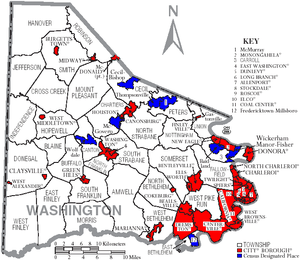 BOROUGHS: Allenport, Beallsville, Bentleyville, Burgettstown, California, Canonsburg, Centerville, Charleroi, Claysville, Coal Center, Cokeburg, Deemston, Donora, Dunlevy, East Washington, Elco, Ellsworth, Finleyville, Green Hills, Houston, Long Branch, Marianna, McDonald (partly in Allegheny County), Midway, New Eagle, North Charleroi, Roscoe, Speers, Stockdale, Twilight, West Brownsville, West Middletown