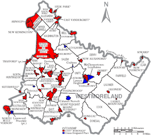 BOROUGHS: Adamsburg, Arona, Avonmore, Bolivar, Delmont, Derry, Donegal, East Vandergrift, Export, Hunker, Hyde Park, Irwin, Laurel Mountain, Ligonier, Madison, Manor, Mount Pleasant, Murrysville, New Alexandria, New Florence, New Stanton, North Belle Vernon, North Irwin, Oklahoma, Penn, Scottdale, Seward, Smithton, South Greensburg, Southwest Greensburg, Sutersville, Trafford (partly in Allegheny County), Vandergrift, West Leechburg, West Newton, Youngstown, Youngwood