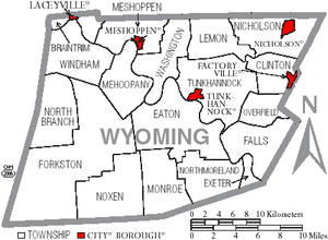 TOWNSHIPS: Braintrim Township, Clinton Township, Eaton Township, Exeter Township, Falls Township, Forkston Township, Lemon Township, Mehoopany Township, Meshoppen Township, Monroe Township, Nicholson Township, North Branch Township, Northmoreland Township, Noxen Township, Overfield Township, Tunkhannock Township, Washington Township, Windham Township