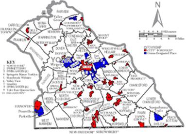 TOWNSHIPS: Carroll, Chanceford, Codorus, Conewago, Dover, East Hopewell, East Manchester, Fairview, Fawn, Franklin, Heidelberg, Hellam, Hopewell, Jackson, Lower Chanceford, Lower Windsor, Manchester, Manheim, Monaghan, Newberry, North Codorus, North Hopewell, Paradise, Peach Bottom, Penn, Shrewsbury, Spring Garden, Springettsbury, Springfield, Warrington, Washington, West Manchester, West Manheim, Windsor, York